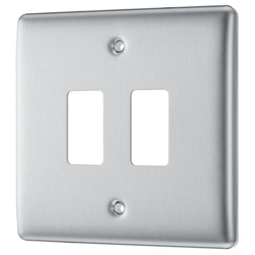 The BG Electrical Nexus Grid RNBS2 is a brushed stainless-steel front plate with 2 module spaces.