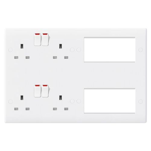 The BG Electrical Moulded 8222EM8 is a white 2x double (2x 2 gang) combination plate with double pole switches and 8 (2x 4) Euro Module slots, rated at 13A.