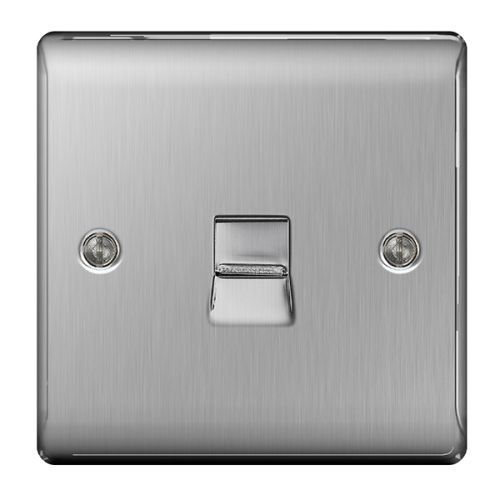 The BG Electrical Nexus Metal NBSBTM1 is a brushed stainless steel single (1 gang) master telephone socket, manufactured by British General Electrical.