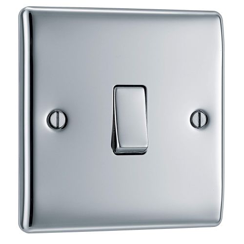 The BG Electrical Nexus Metal NPC12 is a polished chrome single (1 gang) switched electrical socket, manufactured by British General Electrical.