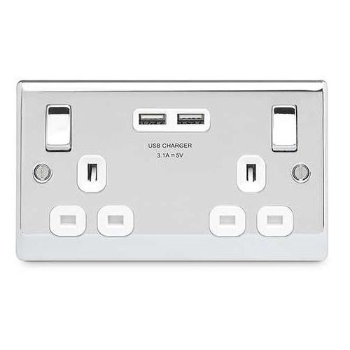 The BG Electrical Nexus Metal NPC22U3W is a polished chrome double (2 gang) switched plug socket with white inserts and 2x 3.1A USB chargers, manufactured by British General Electrical.