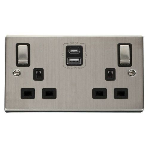 CLICK DECO VICTORIAN STAINLESS STEEL 2G 13A SW SOCKET 4.2A A&C USB INGOT VPSS BLACK