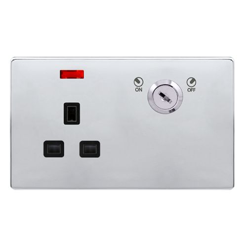 CLICK DEFINITY COMPLETE 13A 1 GANG DOUBLE POLE KEY LOCKABLE SOCKET WITH NEON – POLISHED CHROME COVER PLATE – BLACK INSERT