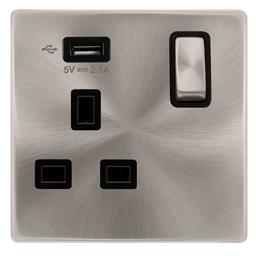 Click Definity Complete 13A Ingot 1 Gang Switched Socket With 2.1A USB Outlet – Brushed Steel Cover Plate – Black Insert