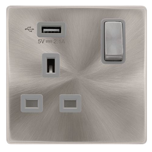 Click Definity Complete 13A Ingot 1 Gang Switched Socket With 2.1A USB Outlet – Brushed Steel Cover Plate – Grey Insert