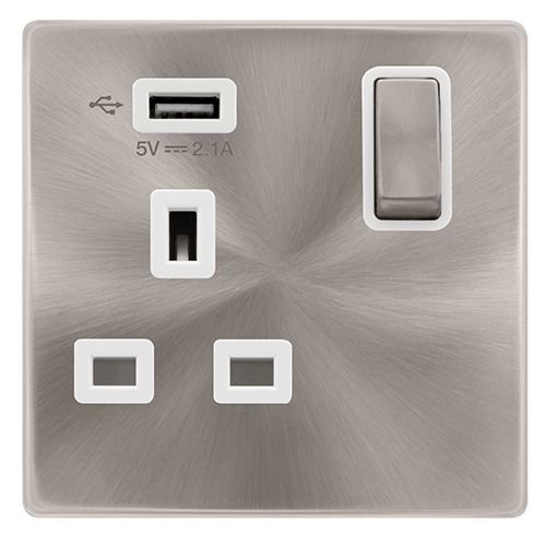 Click Definity Complete 13A Ingot 1 Gang Switched Socket With 2.1A USB Outlet – Brushed Steel Cover Plate – Polar White Insert