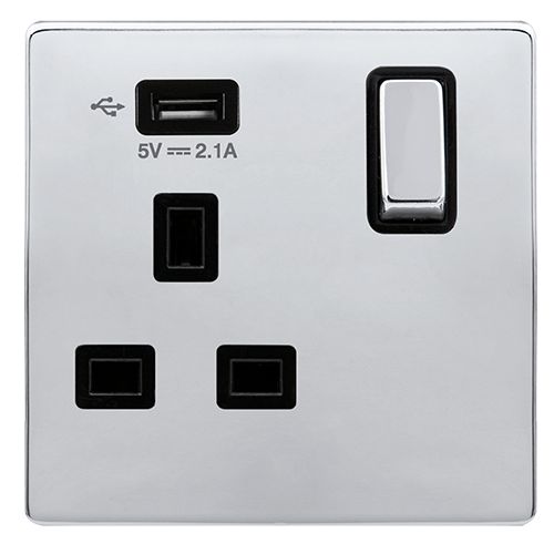 Click Definity Complete 13A Ingot 1 Gang Switched Socket With 2.1A USB Outlet – Polished Chrome Cover Plate – Black Insert