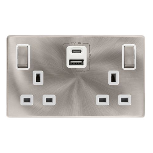 Click Definity Complete 13A Ingot 2 Gang Switched Safety Shutter Socket With Type A & C USB – Brushed Steel Cover Plate – Polar White Insert