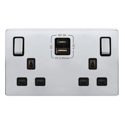 Click Definity Complete 13A Ingot 2 Gang Switched Safety Shutter Socket With Type A & C USB – Polished Chrome Cover Plate – Black Insert
