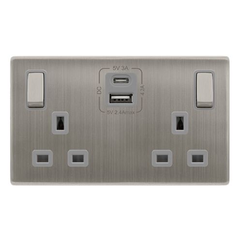 Click Definity Complete 13A Ingot 2 Gang Switched Safety Shutter Socket With Type A & C USB – Stainless Steel Cover Plate – Grey Insert
