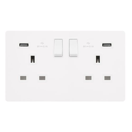 Click Definity Complete 13A Ingot 2 Gang Switched Socket With 2.1A USB Outlets – Metal White Cover Plate – Polar White Insert