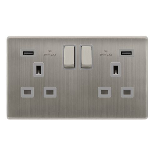 Click Definity Complete 13A Ingot 2 Gang Switched Socket With 2.1A USB Outlets – Stainless Steel Cover Plate – Grey Insert