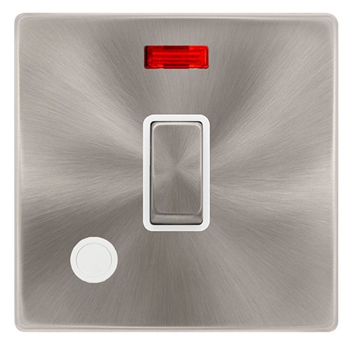 Click Definity Complete 20A Ingot Double Pole Switch With Neon & Flex Outlet – Brushed Steel Cover Plate – Polar White Insert