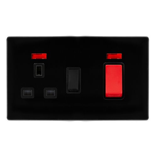 Click Definity Complete 50a Double Pole Switch With 13A Double Pole Switched Socket & Neon – Metal Black Cover Plate – Black Insert