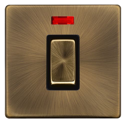 CLICK DEFINITY COMPLETE 50A INGOT 1 GANG DOUBLE POLE SWITCH WITH NEON – ANTIQUE BRASS COVER PLATE – BLACK INSERT