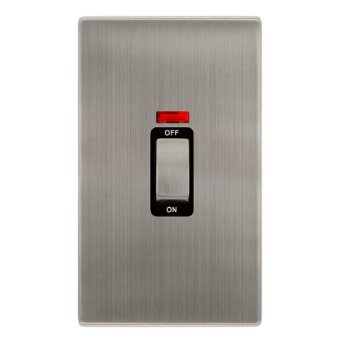 CLICK DEFINITY COMPLETE 50A INGOT 2 GANG DOUBLE POLE SWITCH WITH NEON – STAINLESS STEEL COVER PLATE – BLACK INSERT