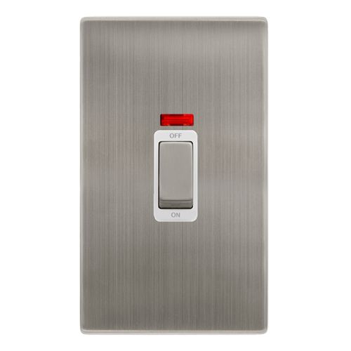 CLICK DEFINITY COMPLETE 50A INGOT 2 GANG DOUBLE POLE SWITCH WITH NEON – STAINLESS STEEL COVER PLATE – POLAR WHITE INSERT
