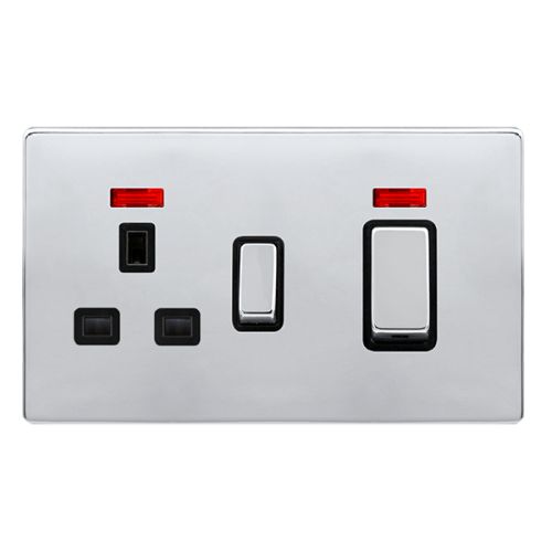 Click Definity Complete 50a Ingot Double Pole Switch With 13A Double Pole Switched Socket & Neon – Polished Chrome Cover Plate – Black Insert