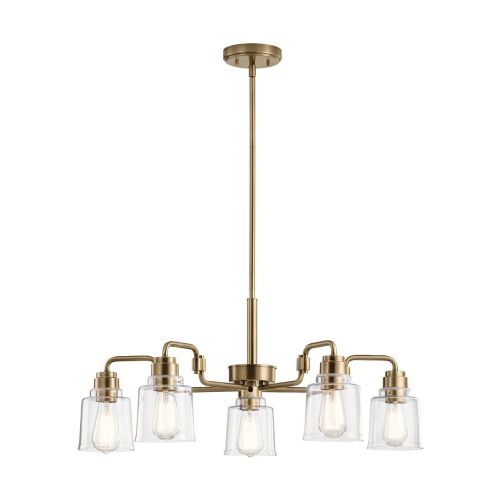 The Aivian 5 lt chandelier has an industrial-style build in a Weathered Brass finish. It’s both refined and edgy, and is complimented with tapered edge glass shades. Convertible to semi-flush.