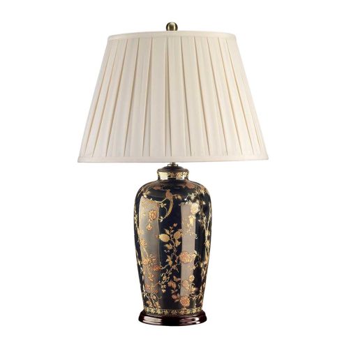 Chinese Porcelain table lamp with a traditional Gold Birds pattern over a Black glaze. Fitted with a wooden base, Cream polycotton double pleat shade, and Aged Brass finial.