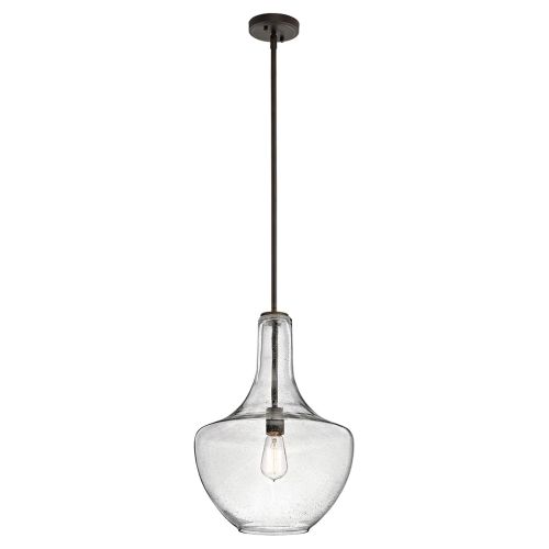 The design of the generously sized Everly collection is based on decorative blown glass containers. Chrome finished pendants feature clear glass and the Olde Bronze finish features seeded glass. These fittings are made more memorable when used with a vintage style LED filament lamp. Contemporary or traditional, these pendants can be used singularly or in multiples to elevate every room.