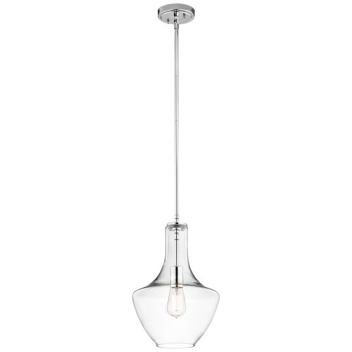 The design of the generously sized Everly collection is based on decorative blown glass containers. Chrome finished pendants feature clear glass and the Olde Bronze finish features seeded glass. These fittings are made more memorable when used with a vintage style LED filament lamp. Contemporary or traditional, these pendants can be used singularly or in multiples to elevate every room.