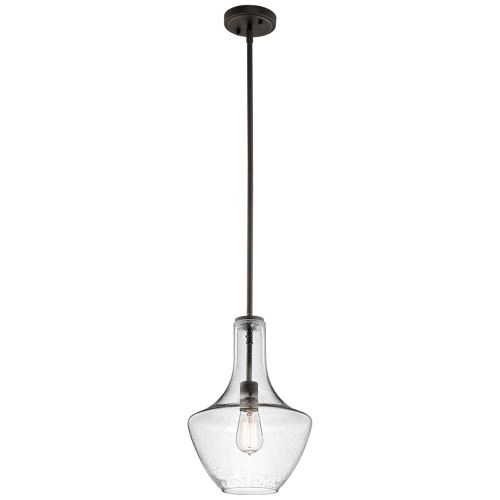 The design of the generously sized Everly collection is based on decorative blown glass containers. Chrome finished pendants feature clear glass and the Olde Bronze finish features seeded glass. These fittings are made more memorable when used with a vintage style LED filament lamp. Contemporary or traditional, these pendants can be used singularly or in multiples to elevate every room.