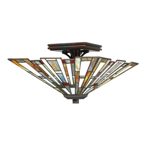 The Maybeck 2Lt ceiling semi-flush light has a tapered staggered edge that emphasizes the intricate details of the Tiffany style glass. Finished in Valiant Bronze, the art glass colour in Tiffany style lighting products vary in colour. No two pieces are identical.