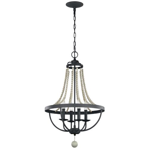 A transistional 4Lt chandelier, the Nori softens the Gothic style, dark weathered zinc iron work, with a gentle drape of driftwood grey beads.