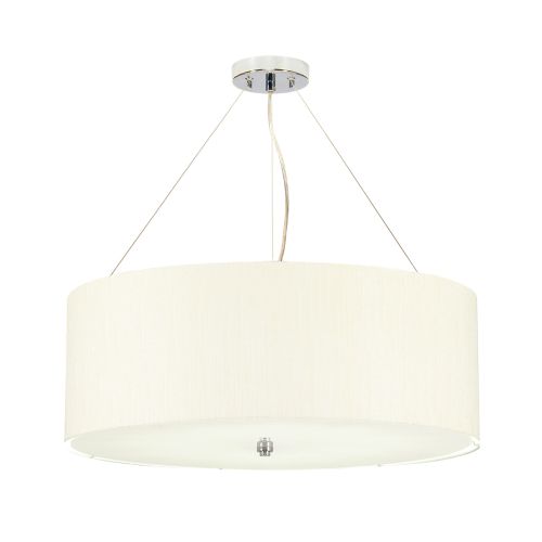 This pendant with suspension wires is available in stock with a faux silk Ivory shade. Choose from 6 different size options with either a Polished Chrome or Aged Brass Ceiling pan and finial. A gloss white acrylic bottom diffuser is included. See our shade catalogue for more shade colours and customised option.