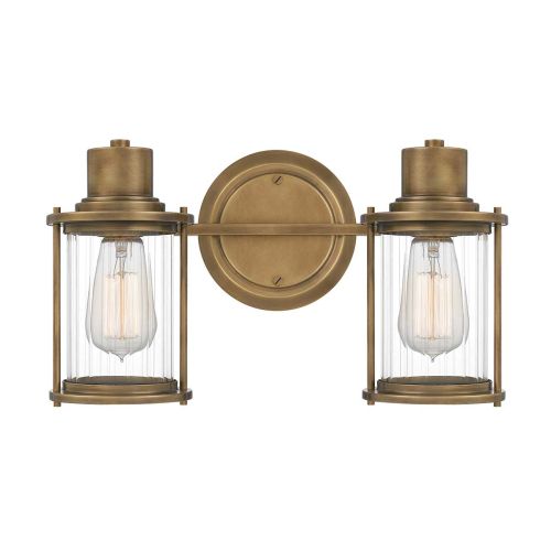 Riggs 2Lt Wall Light, is finished in Weathered Brass, with clear ribbed glass. It has a light industrial look and is IP44 bathroom rated.