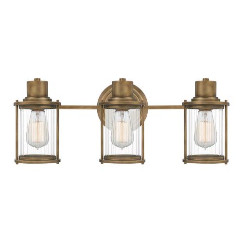 Riggs 3Lt Wall Light, is finished in Weathered Brass, with clear ribbed glass. It has a light industrial look and is IP44 bathroom rated.