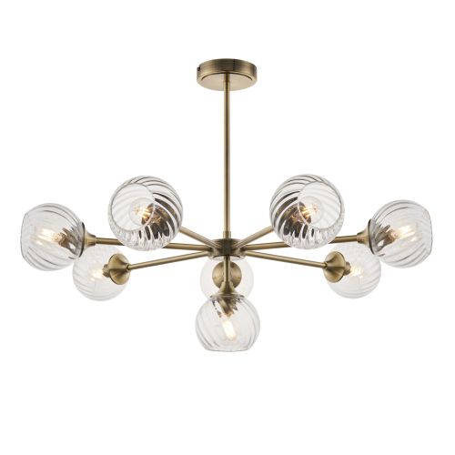 Twisted glass shades give this ceiling light a decorative edge. This 8 light semi flush is perfect for casting light around rooms with low ceilings, finished in a stunning antique brass plate. Matching items also available to complete the look.