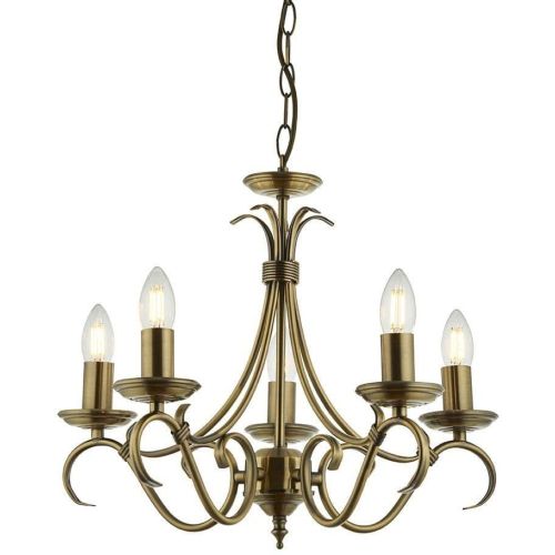 A 5 light ceiling fitting with scrolled arms in antique brass effect finish. suitable for use with LED lamps, height adjustable and dimmable. Matching items available and also comes in an antique silver finish