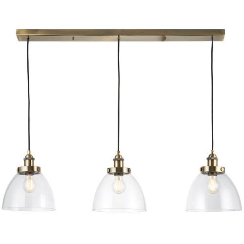 An authentic ‘resto’ style industrial 3 light linear semi flush, finished in antique brass plating with authentic knurled lamp holder details and clear glass shades. Pair with filament LED lamps for that perfect industrial style. Ideal for above a breakfast bar or dining table making the perfect addition for today’s stylish homes to create that on trend bar, bistro look. Other Family items available.