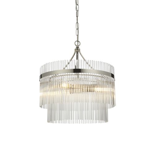 Beautiful contemporary interpretation of the chandelier in polished nickel plated finish. Decorative clear glass rods diffuse the light to create an inviting ambience. The chain can be adjusted to suit ceiling height and allow it to be perfectly hung above dining tables or in living spaces. Matching items also available to create a cohesive look.