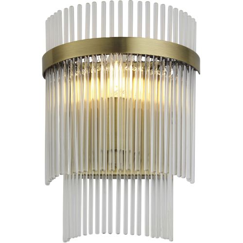Beautiful wall light in antique brass plated finish. Decorative clear glass rods diffuse the light to create an inviting ambience. Matching items also available to create a cohesive look.