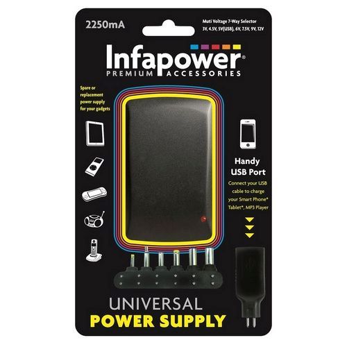 Infapower’s 2250mA Universal Power Supply is ideal for all your gadgets requiring 2250mA or less. It also comes with a USB Port.