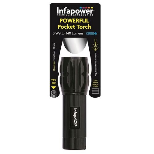 Infapower’s 3 watt Powerful Pocket Torch comes complete with 3 x AAA alkaline batteries.