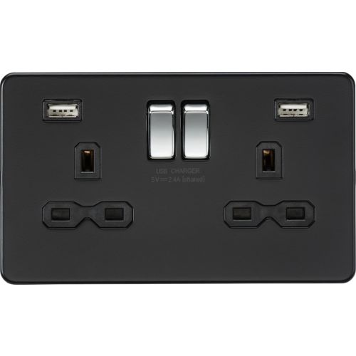 KNIGHTSBRIDGE 13A 2G SWITCHED SOCKET WITH DUAL USB CHARGER A + A (2.4A) – MATT BLACK WITH CHROME ROCKERS ROCKERS