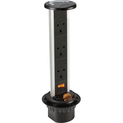 IP54 rated pop up socket for use in kitchen counter tops, offices, boardrooms and hotel rooms. Wherever a discreet power solution is required. This device has a secure clip that locks the unit upright when in use, you can also close the unit with cables plugged in via its innovative cable management cap and inverted socket positions.