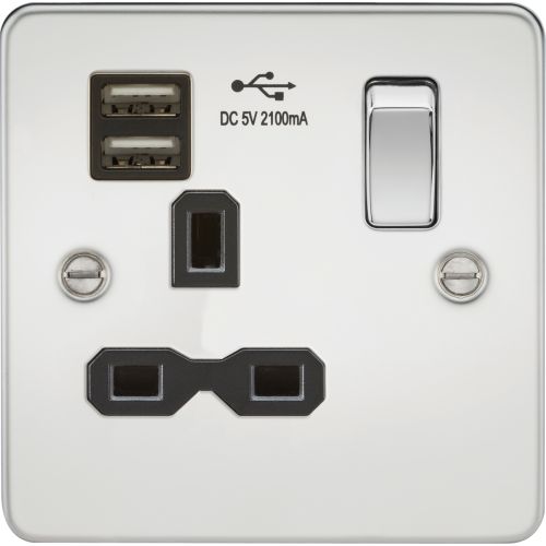 KNIGHTSBRIDGE POLISHED CHROME 1G SWITCHED SOCKET WITH USB (BLACK INS)