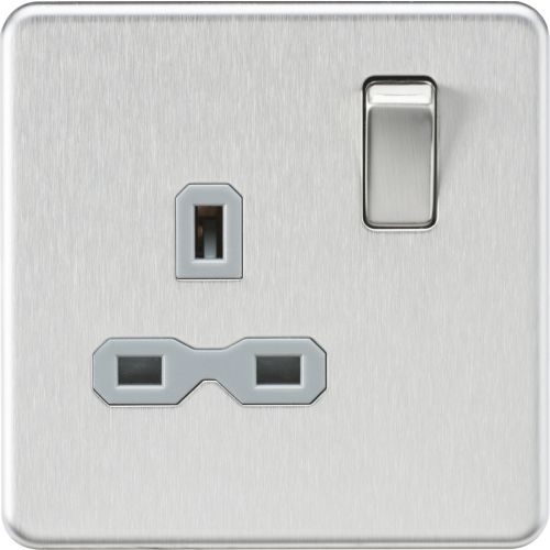 KNIGHTSBRIDGE SCREWLESS 13A 1G DP SWITCHED SOCKET – BRUSHED CHROME WITH GREY INSERT