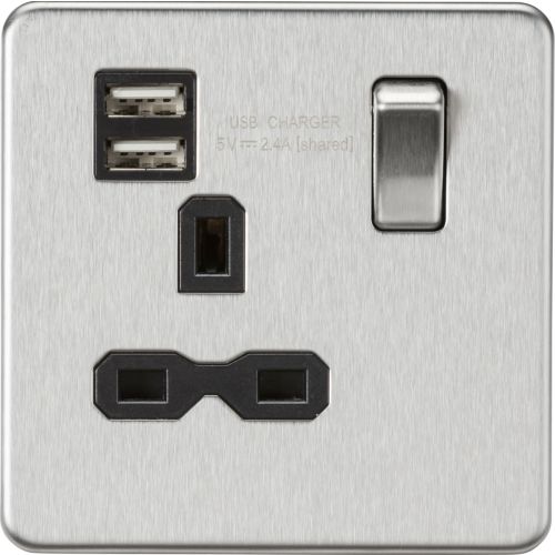 KNIGHTSBRIDGE SCREWLESS 13A 1G SWITCHED SOCKET WITH DUAL USB CHARGER (2.4A) – BRUSHED CHROME WITH BLACK INSERT