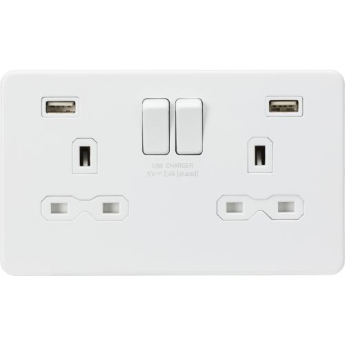 KNIGHTSBRIDGE SCREWLESS 13A 2G SWITCHED SOCKET WITH DUAL USB CHARGER A + A (2.4A) – MATT WHITE