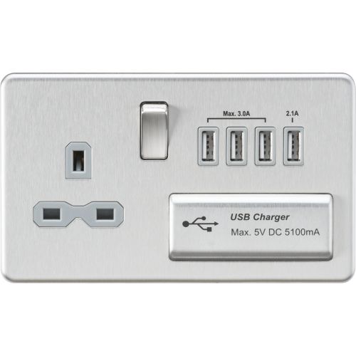 KNIGHTSBRIDGE SCREWLESS 13A SWITCHED SOCKET WITH QUAD USB CHARGER (5.1A) – BRUSHED CHROME WITH GREY INSERT