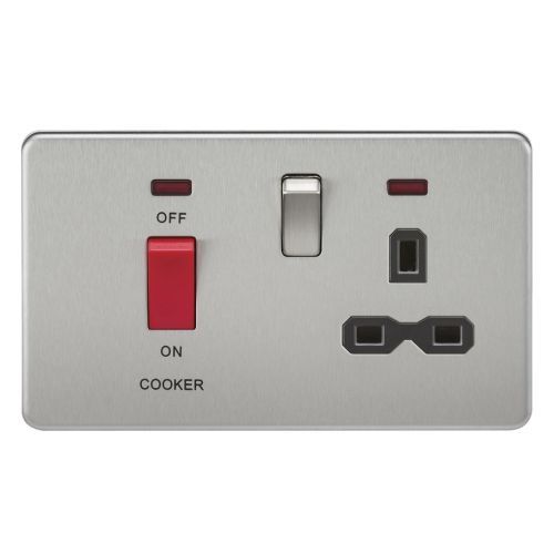 Cooker control units enable isolation of the unit so that maintenance and repairs to be carried out separately. The unit can be switched off, preventing the appliance from being turned on accidentally – for example whilst cleaning. Control two or more cooking appliances in the same room, providing rating is sufficient. This model combines a 45A switch with a 13A socket. Flawless Screwless design.