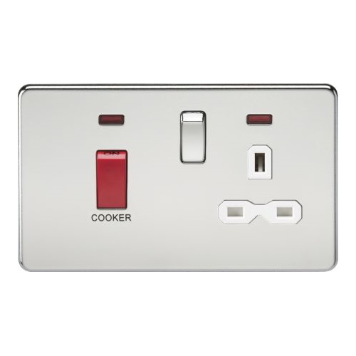 KNIGHTSBRIDGE SCREWLESS 45A DP SWITCH AND 13A SWITCHED SOCKET WITH NEONS – POLISHED CHROME WITH WHITE INSERT