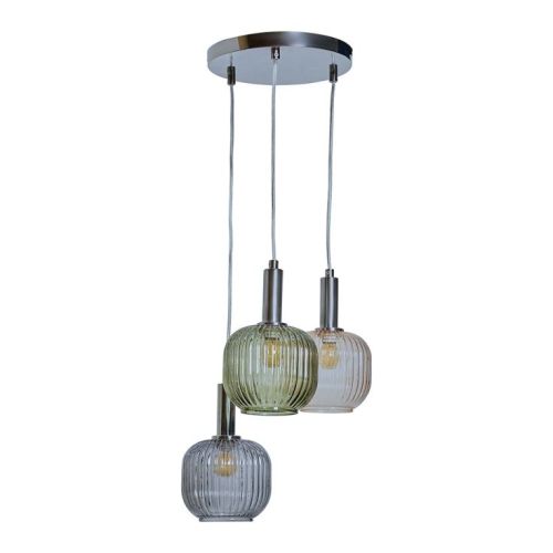 MINISUN STRATTON 3 WAY CHROME CEILING LIGHT WITH COLOURED RIBBED GLASS SHADES (25756)