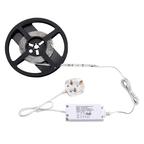 Saxby Flexline 12V 5m kit 12W – Flexline is an indoor LED tape; an energy efficient, adaptable and flexible lighting solution. With its flexible polymer PCB and adhesive backing, it is perfect for accent lighting or mood lighting; use it on bookshelves to highlight ornaments and in kitchens for fully flexible lighting. This complete kit includes everything you need for a quick and easy installation.